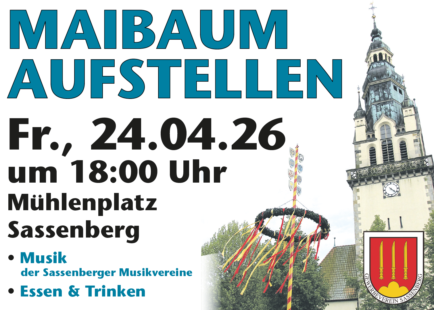 Jedes Jahr Ende April feiert der Gewerbeverein Sassenberg das Maibaum-Aufstellen zusammen mit den Sassenberger Musikvereinen auf dem Mühlenplatz in Sassenberg, um den Wonnemonat Mai willkommen zu heißen. Hier sehen Sie Fotos vom Aufstellen des Maibaums in 2025: